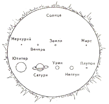 Здесь показаны сравнительные размеры Солнца и девяти больших планет Солнечной системы. Хорошо видно, сколько раз Солнце больше каждой из планет.