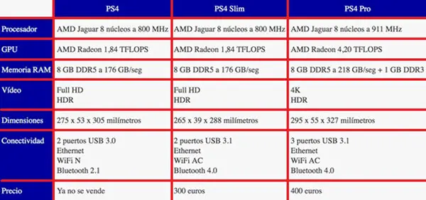 В случае версия PS4 Pro, это имеет Жесткий диск 1 ТБ и имеет возможность начать en поддерживает сети Wi-Fi 5 ГГц. Хотя SLIM также есть Жесткий диск 1 ТБ, но что у него есть Порт USB 3.1 Gen , он также имеет другой порт сзади, в отличие от Pro, которого нет.