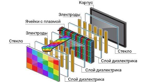 Устройство плазменного телевизора несколько иное. Здесь между двух пластин из стекла располагается ячеистая конструкция, заполненная газом. Через прозрачные электродные пластины на матрицу поставляется электрический ток, под воздействием которого газ превращается в светящуюся в ультрафиолетовом спектре плазму. Это свечение подхватывают RGB люминофоры, посредством чего и формируется изображение.