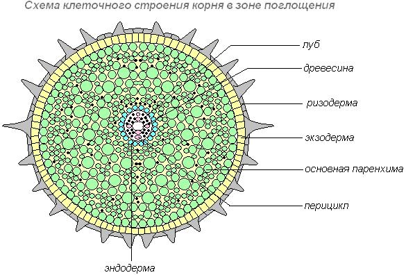 Под микроскопом на поперечном срезе корня в зоне всасывания видно его строение на клеточном и тканевом уровнях. На поверхности корня — ризодерма, под ней — кора. Наружный слой коры — экзодерма, вовнутрь от неё — основная паренхима. Её тонкостенные живые клетки выполняют запасающую функцию, проводят растворы питательных веществ в радиальном направлении — от всасывающей ткани к сосудам древесины. В них же происходит синтез ряда жизненно важных для растения органических веществ. Внутренний слой коры — эндодерма. Растворы питательных веществ, поступающие из коры в центральный цилиндр через клетки эндодермы, проходят только через протопласт клеток.