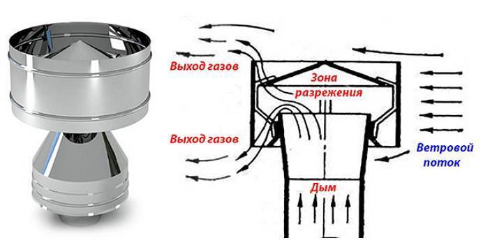 Еще один вариант – монтаж дефлектора. Назначение этого агрегата заключается в усилении тяги, благодаря отклонению воздушных масс, из-за чего давление снижается. Главный недостаток данного прибора — практически нулевая эффективность, если ветра нет. В безветренную погоду дефлектор может даже способствовать опрокидыванию.