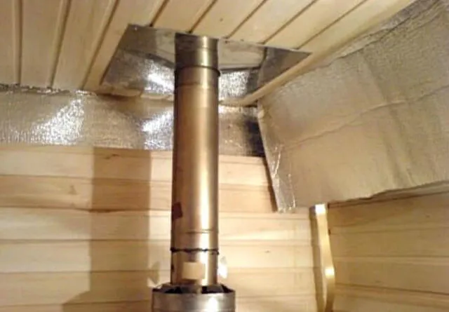 Уделите внимание защите места прохода дымовой трубы через перекрытие бани. Незащищенное дерево начинает обугливаться при 200 °C. Если дерево находится под длительным воздействием источника тепла, самовоспламенение произойдет даже при 170 °C
