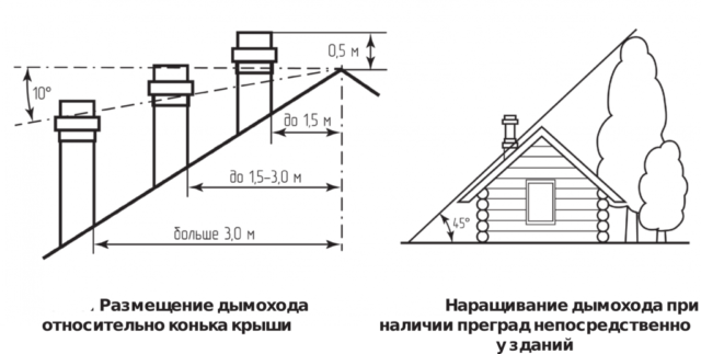 - Если дымоход находится на довольно весомом расстоянии, которое превышает 3 метра, то труба должна быть не ниже угла в десять градусов от конька.