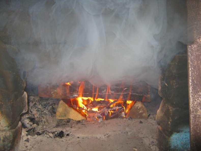 Холодный дымоход при длительном неиспользовании печи приводит к задымлению. Чтобы устранить проблему, в отверстие дымохода помещают зажженную тряпку или бумагу. Канал прогревается, и тяга возобновляется.