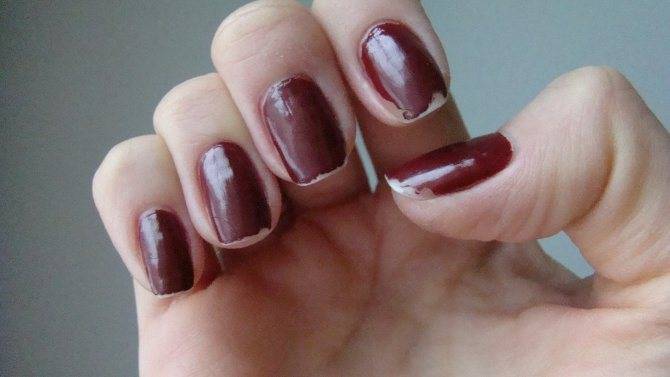 Нарушение технологии выполнения маникюра. Сюда входит неправильное нанесение всех средств на ноготь, игнорирование правильной обработки кутикулы, выполнение обрезного маникюра непосредственно перед использованием гель-лака, нанесение базы и самого покрытия на кутикулу. Так, в случае незапечатывания торца ноготков покрытие отходит на их кончиках уже спустя сутки после нанесения. Нанесение толстого слоя средства в области кутикулы тоже является причиной появления такого дефекта.