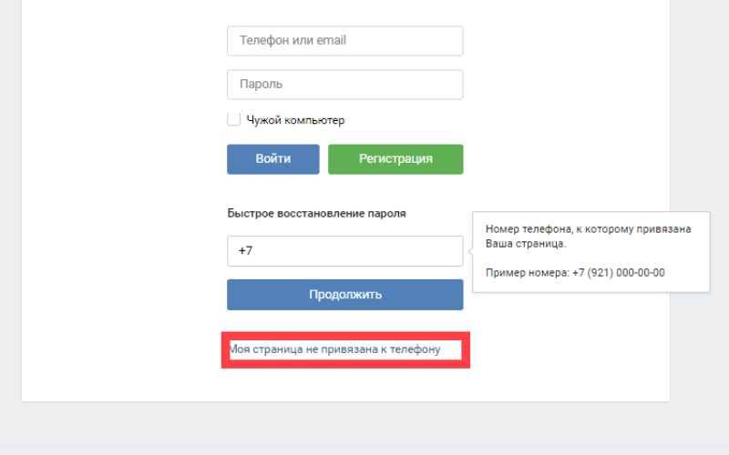 - В этом случае, после нажатия кнопки запроса на восстановление пароля, на обновившейся странице найдите ссылку Моя страница не привязана к номеру телефона;