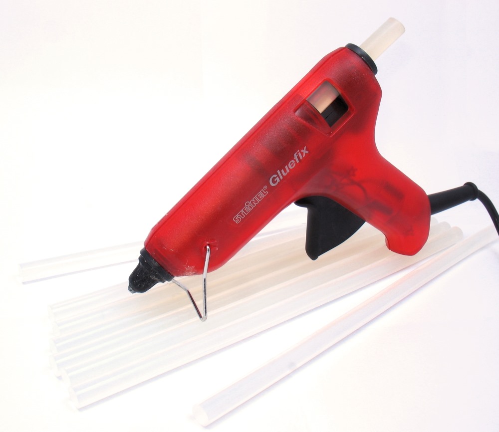Практически в любом магазине для творчества можно приобрести термоклеевой пистолет и стержни с клеем для него. Такой пистолет разогреваясь расплавляет стержни из клея, выдавливая его при нажатии на рычаг. Такой клей отлично липнет ко всем поверхностям, застывает не меняясь в объёме.