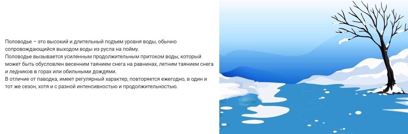 Это обычное природное явление, возникающее всегда в одно и то же время года, весной. Повторяется ежегодно, и характеризуется длительным и высоким подъемом уровня воды в водоемах. В большинстве случаев вода выходит из русла реки, но половодье может протекать и без затоплений береговой территории.