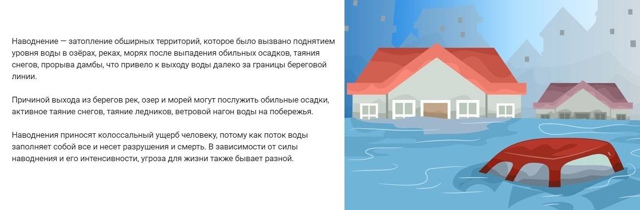 Это всегда крупное стихийное бедствие, имеющее значительные затопления суши. К нему могут привести и паводки, и половодье, и даже человеческий фактор, например, прорыв дамбы.