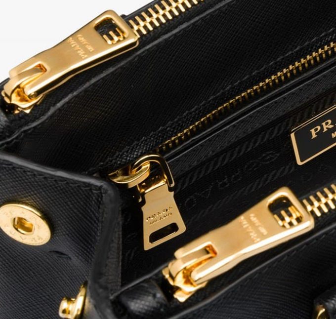 Оттенок фурнитуры на сумке должен соответствовать цвету букв на логотипе. Все молнии, замки, кольца на настоящем аксессуаре обладают одинаковым окрасом. Даже незначительные отклонения в оттенке считаются признаком фальсификата. Все молнии для сумок «Прада» изготавливаются из металла. Только в старых моделях можно встретить zip-застежки.