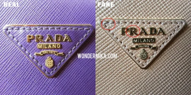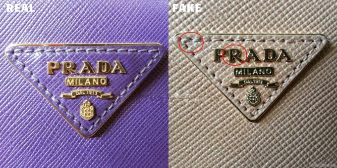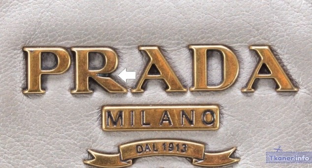 У настоящей сумки Prada на лицевой стороне изделия (в зависимости от задумки дизайнера) спереди, сзади или сбоку есть логотип компании. Он выглядит, как пластина из металла, прикрепленная к изделию заклепками. Символы надписи немного объемные, а оттенок эмали близок к оттенку самой модели. На некоторых сумках он может пришиваться нитками, а пластина не металлическая, а кожаная. Все интервалы между буквами и символами пропорциональные. В зависимости от времени изготовления, коллекции буква R может иметь прямую или изогнутую правую ножку. На репликах эта деталь параллельно с правой ножкой буквы A.