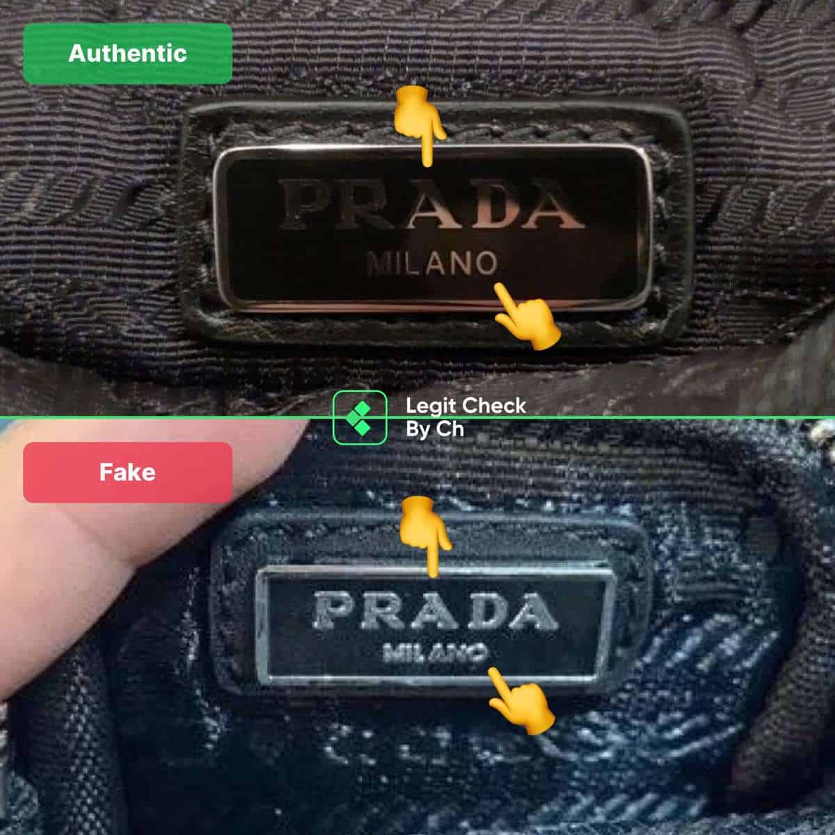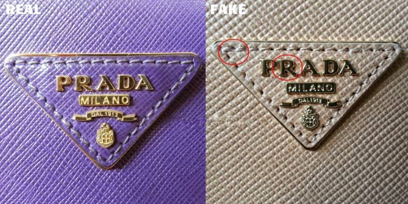 У настоящей сумки Prada на лицевой стороне изделия (в зависимости от задумки дизайнера) спереди, сзади или сбоку есть логотип компании. Он выглядит, как пластина из металла, прикрепленная к изделию заклепками. Символы надписи немного объемные, а оттенок эмали близок к оттенку самой модели. На некоторых сумках он может пришиваться нитками, а пластина не металлическая, а кожаная. Все интервалы между буквами и символами пропорциональные. В зависимости от времени изготовления, коллекции буква R может иметь прямую или изогнутую правую ножку. На репликах эта деталь параллельно с правой ножкой буквы A.