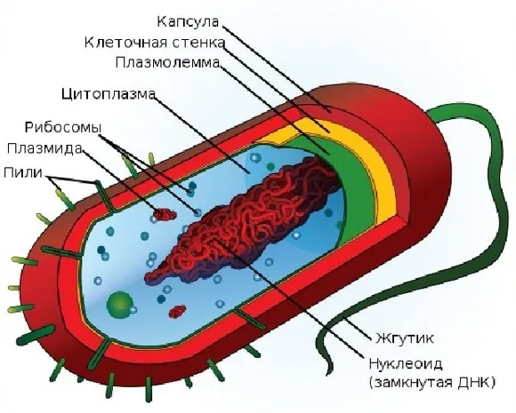 Снаружи клетки прокариот, так же как и эукариотические клетки, покрыты плазматической мембраной. Строение мембран у двух этих групп организмов одинаковое. Клеточная мембрана прокариот образует многочисленные впячивания внутрь клетки – мезосомы. На них располагаются ферменты, обеспечивающие реакции обмена веществ в прокариотической клетке. Поверх плазматической мембраны клетки прокариот покрыты оболочкой, состоящей из углеводов, напоминающей клеточную стенку растительных клеток. Однако эта стенка образована не клетчаткой, как у растений, а другими полисахаридами – пектином и муреином. В цитоплазме прокариотических клеток нет мембранных органоидов: митохондрий, пластидов, ЭПС, комплекса Гольджи, лизосом. Их функции выполняют складки и впячивания наружной мембраны – мезосомы. В цитоплазме прокариот беспорядочно располагаются мелкие рибосомы. Цитоскелета в прокариотических клетках тоже нет, но иногда встречаются жгутики, которые способствуют передвижению бактерий. На поверхности бактериальной клетки находятся пили – белковые нити, с помощью которых бактерии присоединяются к субстрату или поверхности. Половые пили служат для обмена генетического материала между различными бактериями.