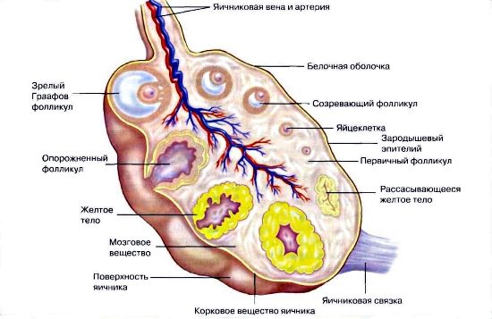 Яичник внутри себя содержит фолликулы, внутри которых созревают яйцеклетки. По мере своего развития фолликул продвигается на поверхностность и, в конце концов, прорывается, выпуская созревшую яйцеклетку в брюшную полость. Этот процесс называется овуляцией. Затем ее захватывают фимбрии и отправляют в путешествие по фаллопиевым трубам.