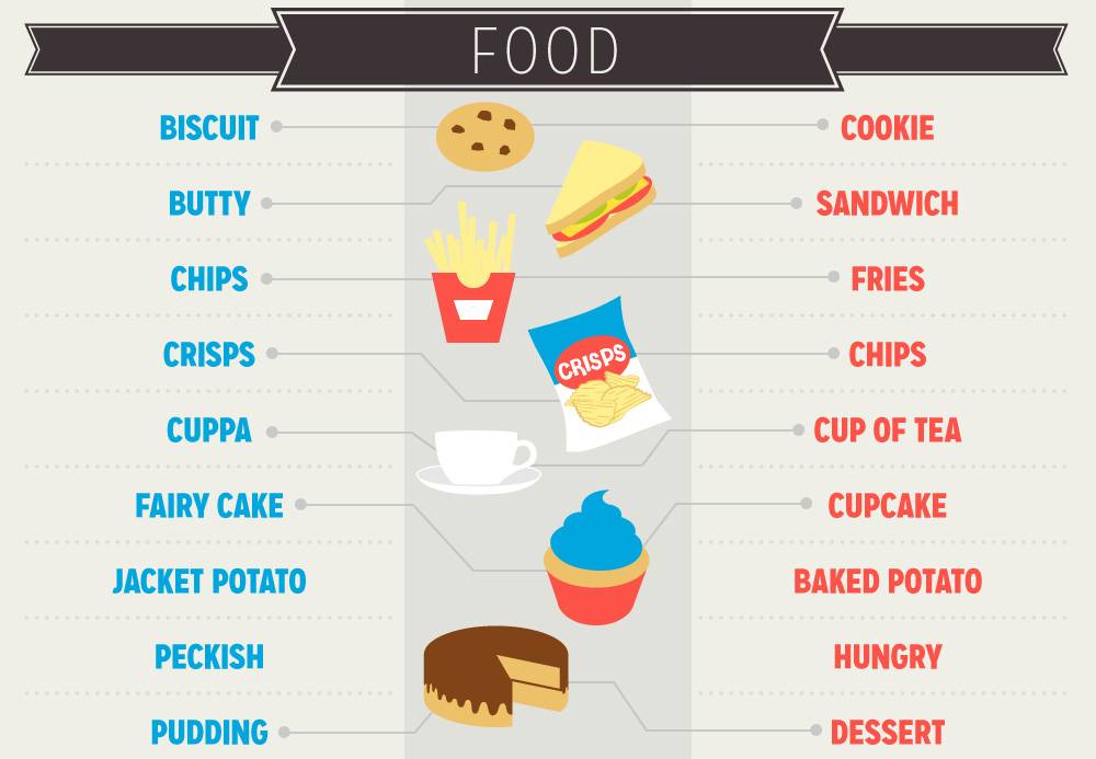 В ней различия наиболее заметны. Можно попасть в неловкое положение, похвалив в Англии pants собеседника, а не trousers (трусы, а не штаны), хотя в США слово означает именно брюки. Если вы пригласите американца поиграть в football, то он придёт на игру в шлеме, подумав, что речь шла об американском футболе, а не о soccer (классическом футболе).