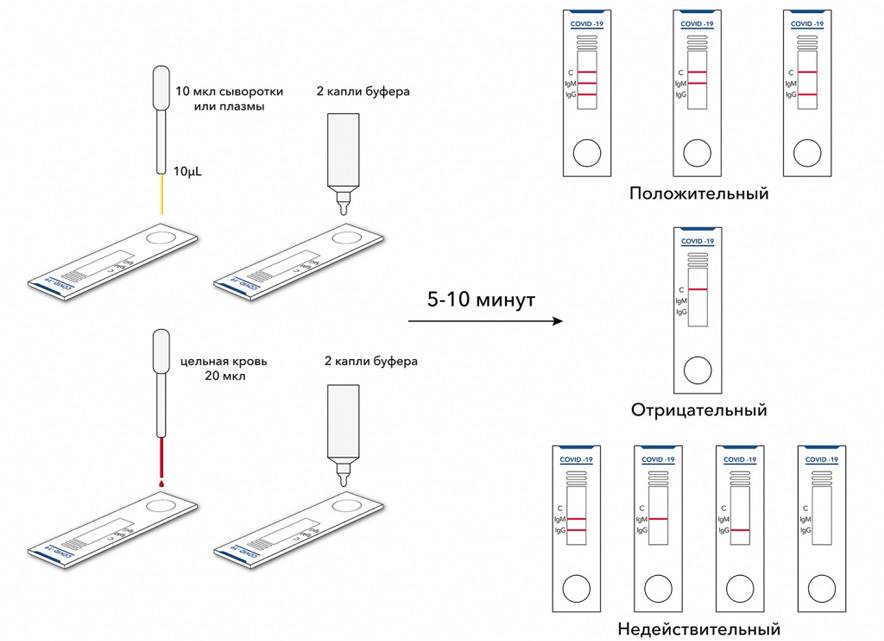 Как пояснил Альберт Ризванов, экспресс-тесты определяют антитела IgM (вырабатываются в самом начале и указывают на активную фазу инфекции или же на то, что человек переболел совсем недавно) или IgG («взрослые» антитела, которые появляются к концу болезни). Само тестирование проходит по следующему алгоритму: берется капля крови, капается в специальное окошко на тест-полоске, а сверху наносится рабочий раствор. Результат готов уже через 8—10 минут. Одна полоска должна проявляться всегда — это значит, что тест сработал, две других полоски показывают антитела M и G.