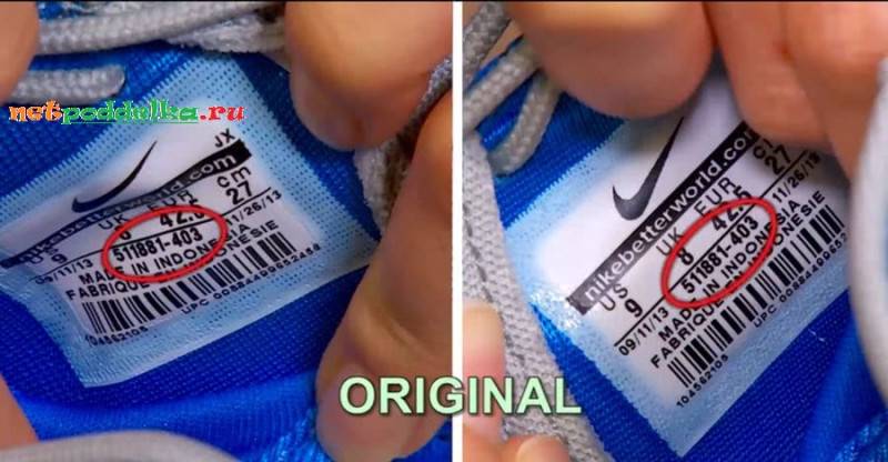 Чтобы отличить оригинал кроссовок от их копий, достаточно провести сверку идентификационного номера у нужной пары. На язычке обуви (изнутри) обычно прикреплен товарный артикул, на нем находится информация — 12-значный номер. Он помечен ниже размерного ряда. Обычно бумажный артикул крепят к левому кроссовку. На нем на нескольких языках описаны составляющие компоненты.
