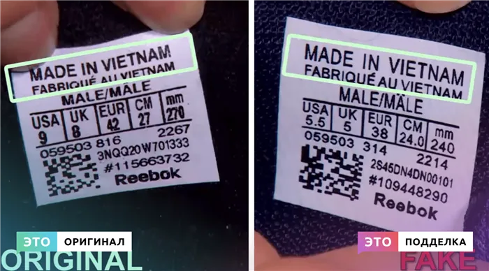 Например, покупатель решает приобрести пару спортивной обуви известного бренда и хочет знать, как отличить оригинал от подделки Reebok Classics. На коробке написано, что они были сделаны во Вьетнаме.