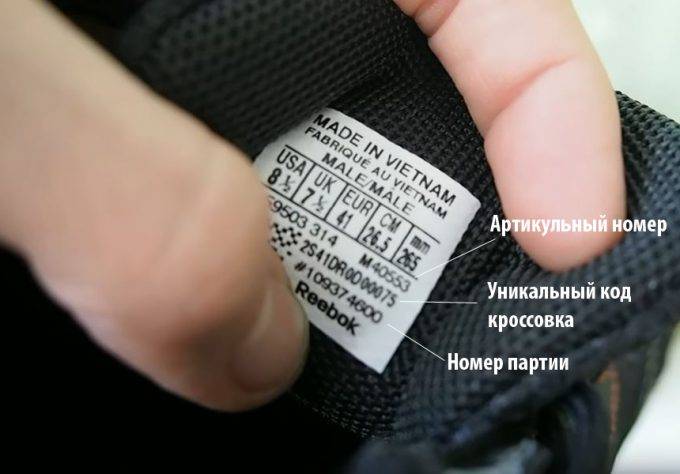 Кроссовки Reebok маркированы и пришиты. Они расположены внутри изделия. Обычно они содержат следующую информацию:.