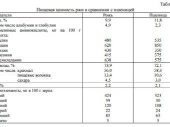 Для потребителей интересен еще один вопрос – какой злак полезнее. Питательность пшеницы несколько больше, она позволяет получить более вкусный хлеб. Но разница в энергетической ценности составляет всего 1 калорию (338 и 339 соответственно). Поэтому на реальной питательности хлеба больше отражаются иные компоненты и технологические моменты его производства. На 100 г ржаного зерна приходится: