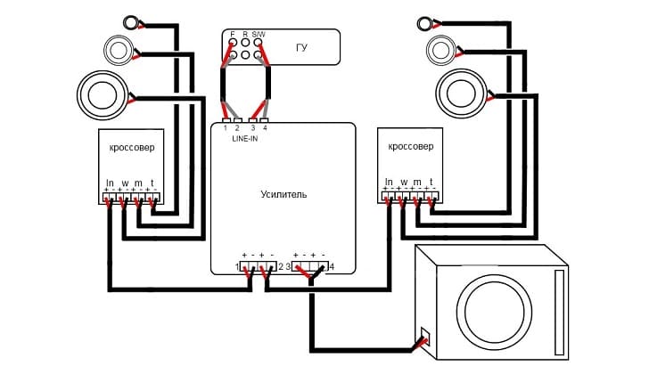 - Сабвуфер подсоединяют к выходам, к которым уже подключены акустические системы. Будет параллельная работа в диапазоне низких частот.