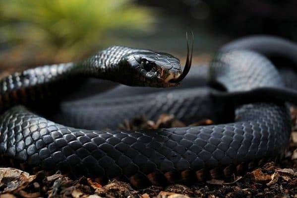 Черная мамба имеет и второе название черный рот. Эта змея, обитающая в Африке, смертельно опасна для человека. Для летального исхода достаточно, чтобы в организм попало всего 15 мг ее яда, а при наличии тяжелых заболеваний или для детей и 10 мг токсина будут смертельны. Встречается пресмыкающееся в редколесье и в саваннах в тропических районах Африканского континента. Не редко ее замечают и около термитников. Окраска тела может быть от темно-серой до темно-коричневой. Название же появилось из-за окраски слизистой пасти, которая полностью черная. Если посмотреть фото со змеей в момент атаки, это будет хорошо видно.