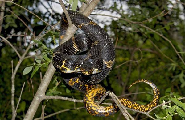 Второе название змей соответствует окрасу – мокасиновые. Обитает преимущественно на юго-востоке США. Коварство змеи проявляется в укусах без предупреждения. Яд нарушает свертываемость крови, вызывает тошноту, боль. Готовность к атаке отражена в позе, похожей на букву S.