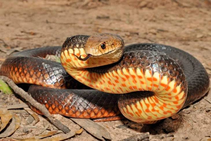 Самая ядовитая змея в мире Тайпан Маккоя может иметь коричневый окрас, брюхо – светлее тела, глаза змеи кажутся полностью черными