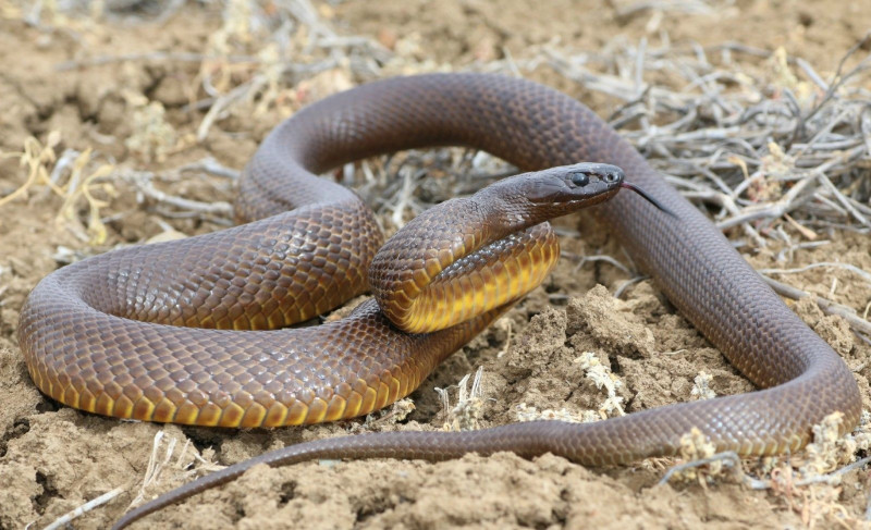 Самая ядовитая змея в мире Тайпан Маккоя может иметь коричневый окрас, брюхо – светлее тела, глаза змеи кажутся полностью черными