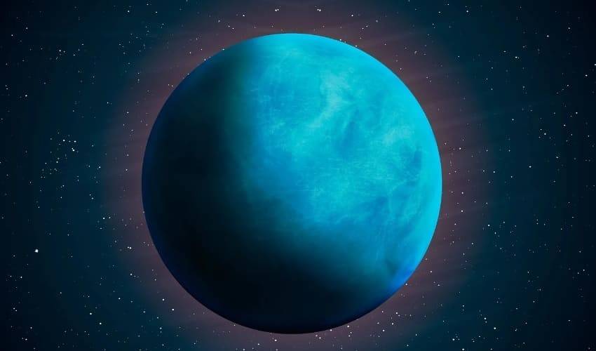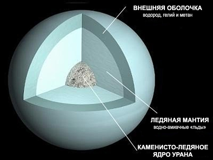 Голубого цвета из-за ледяной оболочки и метана в составе гелиево-водородной атмосферы. Имеет 27 естественных спутника. В центре — каменное ядро.