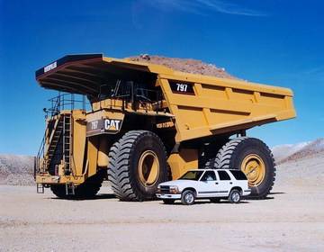 Caterpillar 797В с габаритами 14,8×9,5×7,7 м – не самый большой, но один из них. Оснащён дизельным мотором на 3 560 л. с., а также компьютеризированной трансмиссией. Движется 68 км/ч на максимальном скоростном режиме.