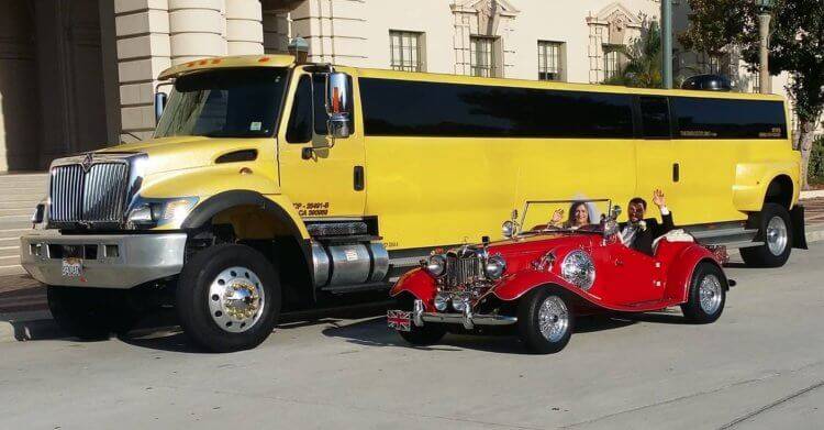 Лимузин Colossus Limo рядом с классическим автомобилем 20-века