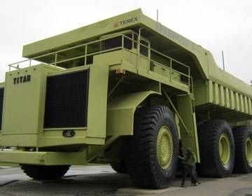 Terex 33-19 «Titan» очень долго был лидером в плане грузоподъёмности, поскольку рассчитан на транспортировку тяжести до 350 тонн, а вес самой машины – 235 тонн. С 1991 года грузовик относится к категории музейных экспонатов, серийное производство так и не было налажено. Габариты – 20,3×7,8×6,9.