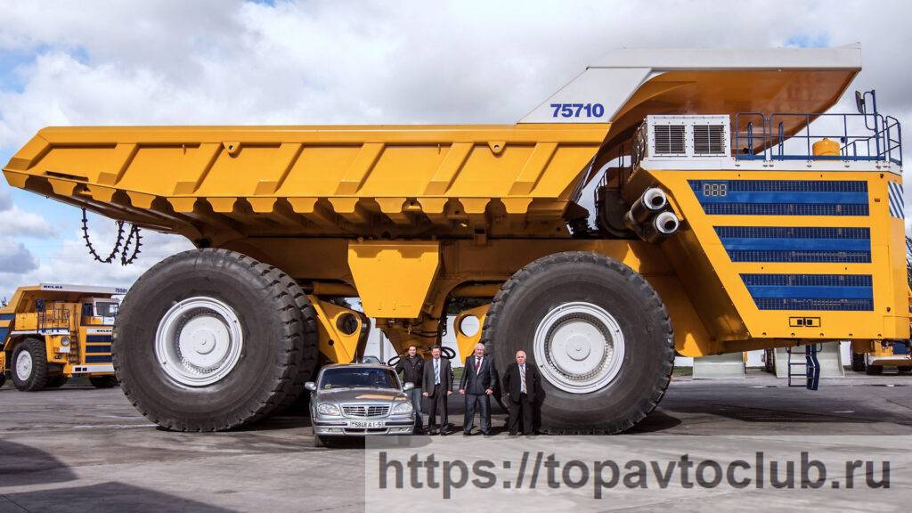 БелАЗ 75710 – крупнейший в мире самосвал, рассчитанный на транспортировку груза до 450 тонн. Максимальная вместительность – 503 тонны, это и стало поводом для занесения этого гиганта в книгу рекордов Гиннеса. Габариты – 20,6×9,75×8,17 м. Оптимальный для работы температурный диапазон от +50 до -50 градусов по Цельсию.