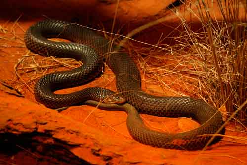 Коричневый король — так называют эту австралийскую змею, живёт в пустынях, светлых лесах, на лугах и пастбищах. Обладая немалыми размерами, к людям она относится без боязни. При встрече с опасностью мулга расширяет мышцы шеи, показывая, что к ней лучше не приближаться. Это может служить для человека сигналом о её готовности напасть, поэтому единственный выход — замереть на месте и не провоцировать. Не стоит пытаться от неё убежать, поскольку она реагирует на движение и может броситься вдогонку. Смертельные случаи после встречи с мулгой нередки, так как при укусе она выделяет огромное количество яда — около 150 мг.