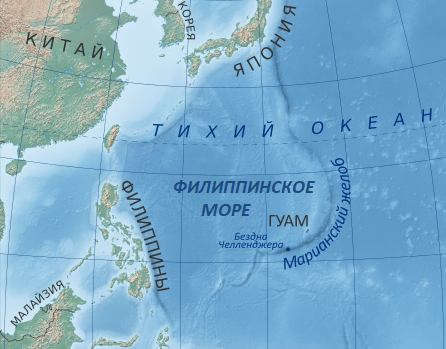 Филиппинское море – это окраинное море, расположенное к северо-востоку от Филиппинского архипелага и в западной части Северного Тихого океана. Оно омывает Филиппины и Тайвань на западе, Японию – на севере, Марианские острова – на востоке, и архипелаг Палау – на юге. Площадь поверхности составляет около 5,7 млн. км². Море имеет сложный и разнообразный подводный рельеф. Дно сформировалось в процессе геологических разломов. Особенностью Филиппинского моря является наличие , среди которых Филиппинский жёлоб и Марианская впадина, содержащая самую глубокую точку на планете. Многочисленные подводные горы расположились в водах моря, и некоторые из них вулканического происхождения.