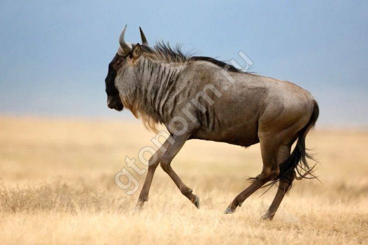 Антилопа гну внешне совсем не похожа на свою предшественницу — вилорогую антилопу. Вес гну может достигать двухсот килограммов, а её морда больше похоже морду яка или коровы, да ещё имеет гриву и бороду. Правда, на быстроту это ничуть не влияет — убегая от хищников, стада этих животных могут бежать около 80 км/ч, так что может уверенно занимать третье место в списке самых быстрых в мире животных!