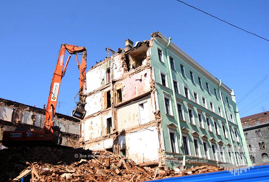 Снос здания для строительства будущего вестибюля метро «Адмиралтейская» и торгового центра
