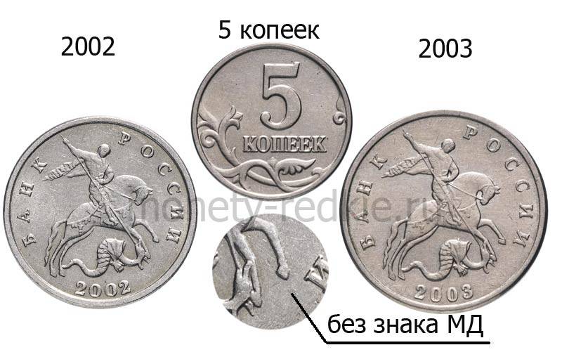 Фото редких 5 копеек 2002 и 2003 годов без обозначения МД