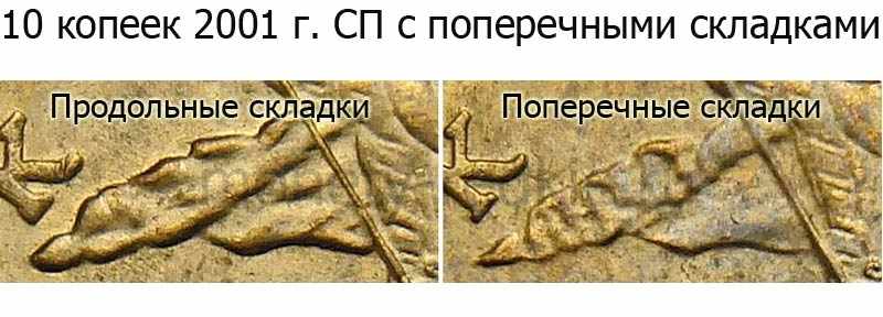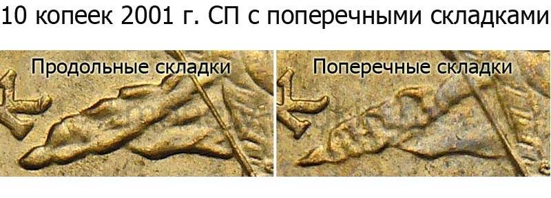 10-копеечная монетка 2001 года с буквами СП и поперечными складками на плаще (ее стоимость составляет 1000 2000 Р.)