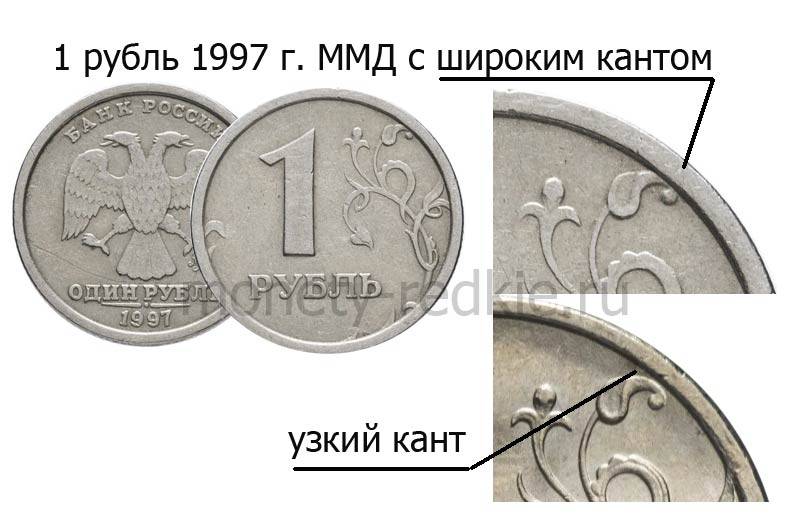 Вариант 1-рублевой монеты 1997 года ММД с широким кантом оценивается от 1 до 6 тыс. руб.