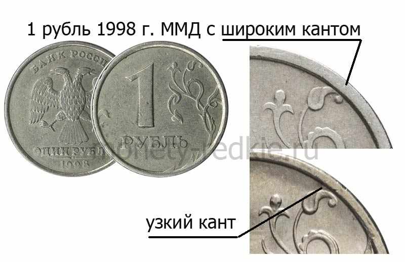 1 рубль 1998 года ММД с широким кантом (цена – 2000 – 3000 Р.)