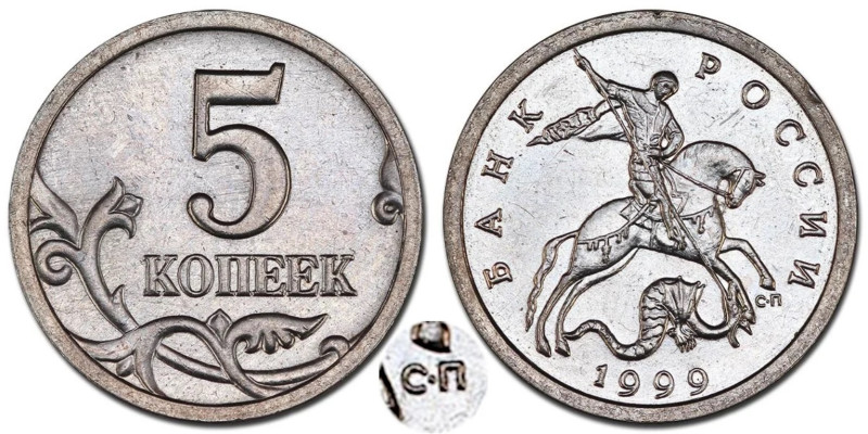 На сегодняшний день 5 рублей 1999 года, отчеканенные на Санкт-Петербургском монетном дворе, считаются самой дорогой монетой России. Не так давно об этой необычной монете рассказывали в одной из передач «Первого канала». Коллекционерам известны как минимум два экземпляра. Одна из монет по легенде была найдена в 2009 году в копилке человеком, не увлекающимся нумизматикой.