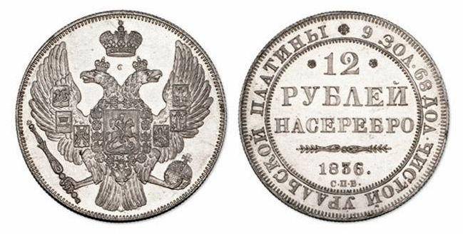 Чеканить платиновые монеты научились только в девятнадцатом веке, а именно в 1835 году. Сзади был изображен герб Российской империи, а спереди – надпись «На серебро». Можно было встретить только три вида платиновых монет: номиналом 3, 6 и 12 рублей. По форме изделия напоминали серебряные монеты, но платина была в 6 раз дороже. Поэтому на такую денежную единицу можно было приобрести намного больше товара. К примеру, монета номиналом 6 рублей была дороже в 6 раз, чем такая же серебряная. Об этом как раз и говорила надпись «На серебро». В процессе изготовления монет использовалась чистая платина, добытая на Урале. С 1846 года платину перестали использовать для чеканки, поскольку стало появляться огромное количество подделок. Серебряные монеты было легко спутать с платиновыми, поэтому купцы стали возмущаться. Все металлические дензнаки изъяли из обращения, а до наших дней сохранились только единичные экземпляры. Именно поэтому их стоимость является настолько высокой. Хотя найти подобную вещь в своем кошельке уж точно не удастся: для этого надо организовывать целые археологические раскопки.