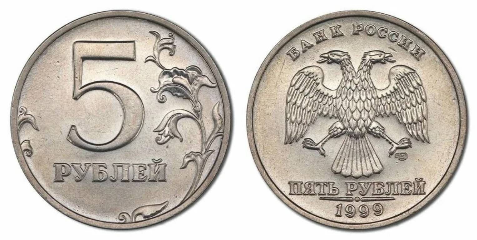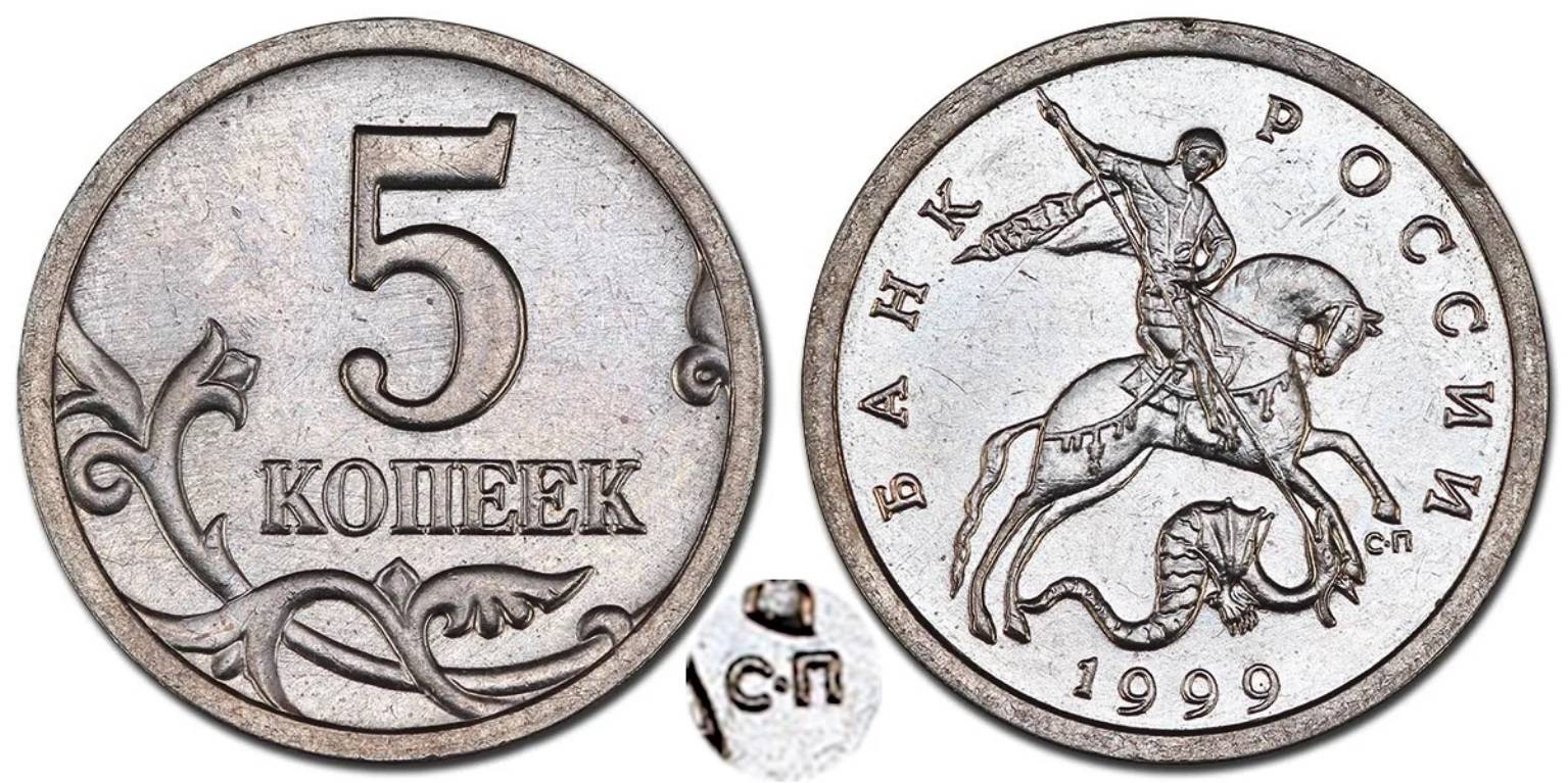 На сегодняшний день 5 рублей 1999 года, отчеканенные на Санкт-Петербургском монетном дворе, считаются самой дорогой монетой России. Не так давно об этой необычной монете рассказывали в одной из передач «Первого канала». Коллекционерам известны как минимум два экземпляра. Одна из монет по легенде была найдена в 2009 году в копилке человеком, не увлекающимся нумизматикой.