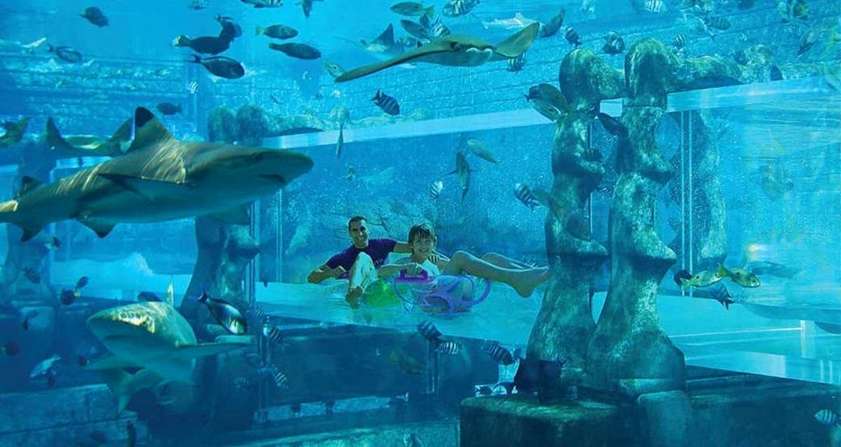 В парке есть 30-метровая башня, с которой берут начало 7 различных горок. Для любителей экстремальных видов спорта — захватывающая горка под прямым углом через аквариум с акулами.