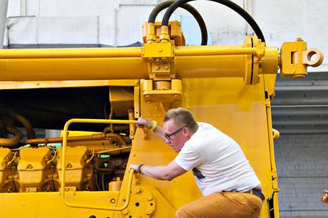 Шоумен Сергей Стиллавин, прибывший на ЧТЗ для съёмок тест-драйва танка «Т-34», не отказал себе в удовольствии вскарабкаться на бульдозер «Т-800».