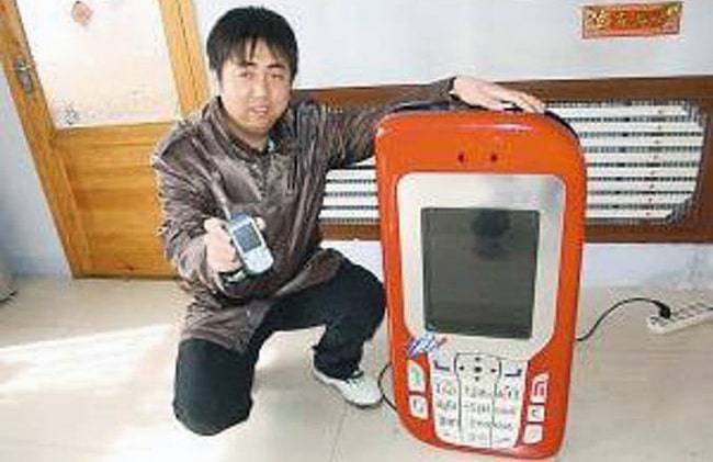 Самый большой переносной телефон удалось сконструировать китайскому умельцу по имени Тан. Его устройство превышало аналог в 620 раз! Аппарат Тана достигает в длину 90 см и весит порядка 22 килограммов. Конечно, с таким агрегатом ходить сможет далеко не каждый.
