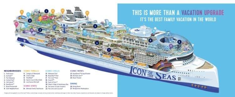 Длина корабля Icon of the Seas составляет 365 метров — благодаря крупному размеру, его грузоподъемность оценивается в 250 800 тонн. Это значит, что он может вместить 5600 гостей и 2350 членов экипажа. Для сравнения, грузоподъемность «Титаника» составляла 46 328 тонн, поэтому считается, что лайнер Icon of the Seas в 5 раз крупнее легендарного корабля.