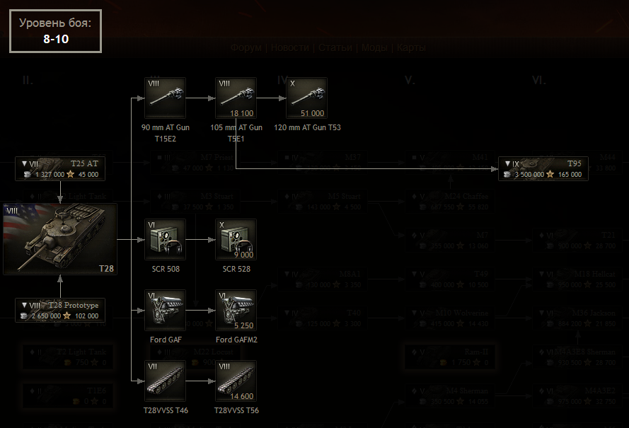 Конечно не могут не радовать уже открытые предтоповое орудие и радиостанция. Однако если вы уже прокачивали альтернативную ПТ Т28 прототип, то орудие и двигатель уже должны быть открыты.